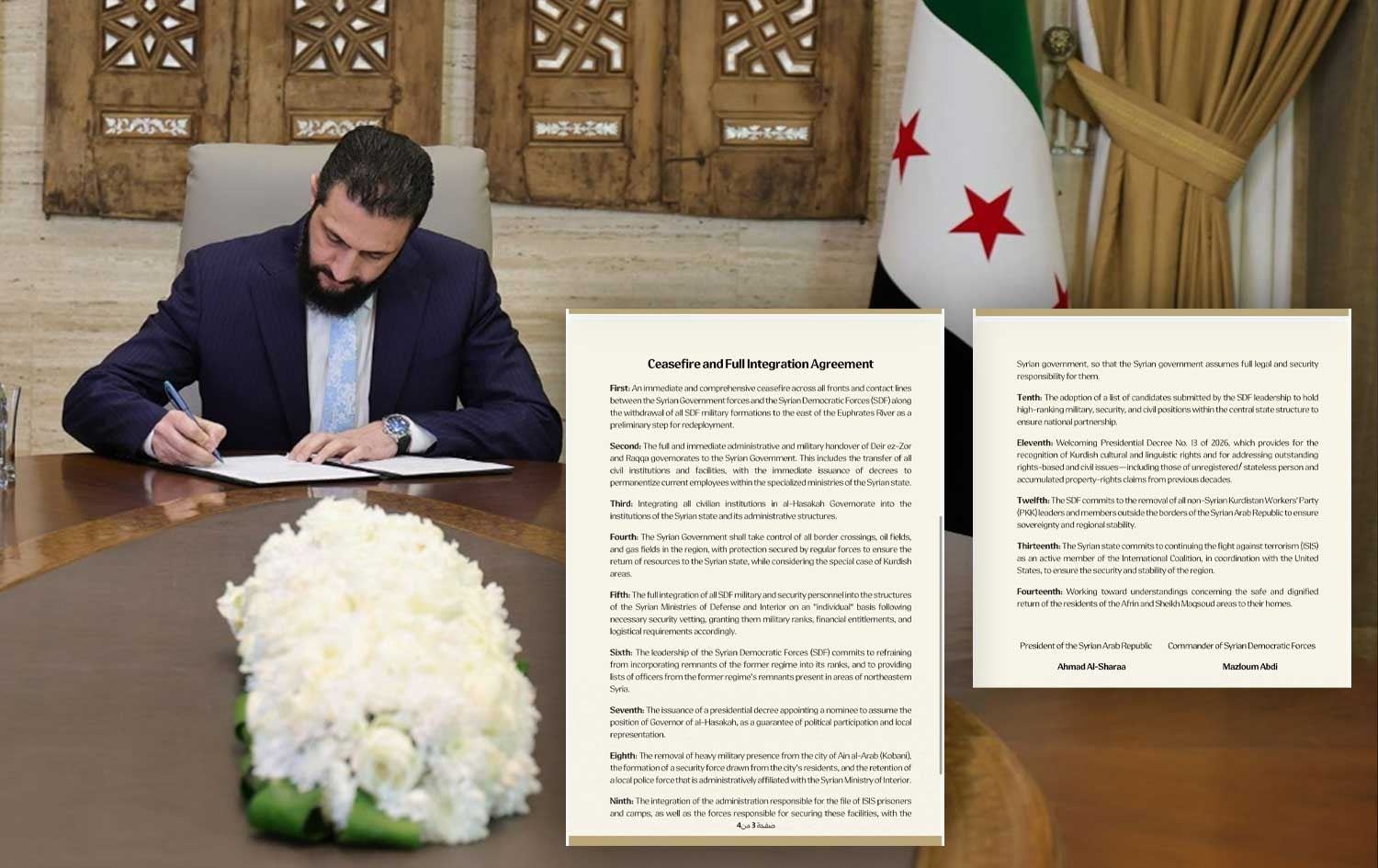 Syrian interim President Ahmed al-Sharaa said the agreement was signed remotely with SDF commander Mazloum Abdi, who was unable to come to Damascus due to bad weather. Earlier in the day, Sharaa met at the presidential palace with the US special envoy for Syria, Tom Barrack [13], who seems to have had a hand in brokering the agreement.